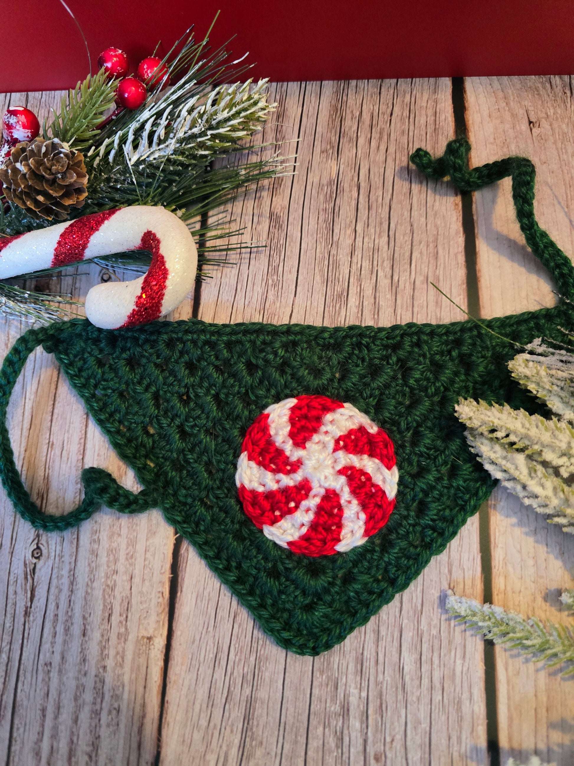 - Forest green main bandana with no border. Peppermint in white (inner) and red (outer)