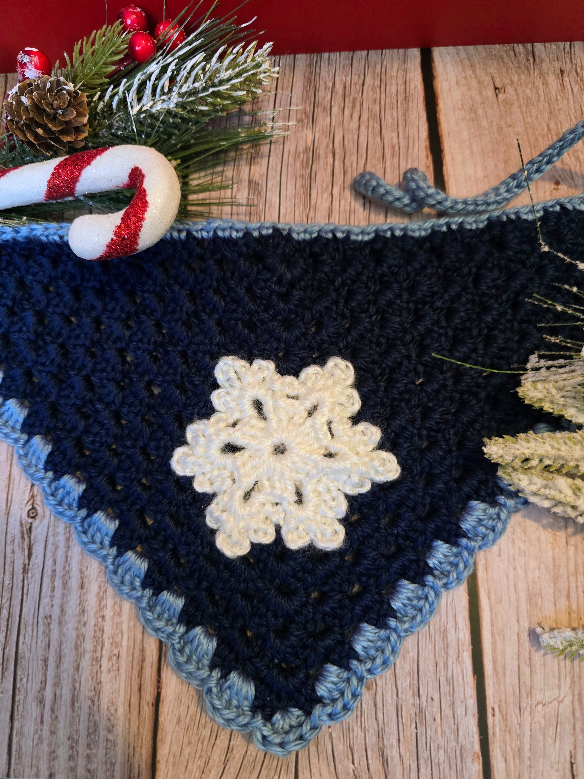 - Navy blue main bandana with light blue ruffle border. Snowflake in white