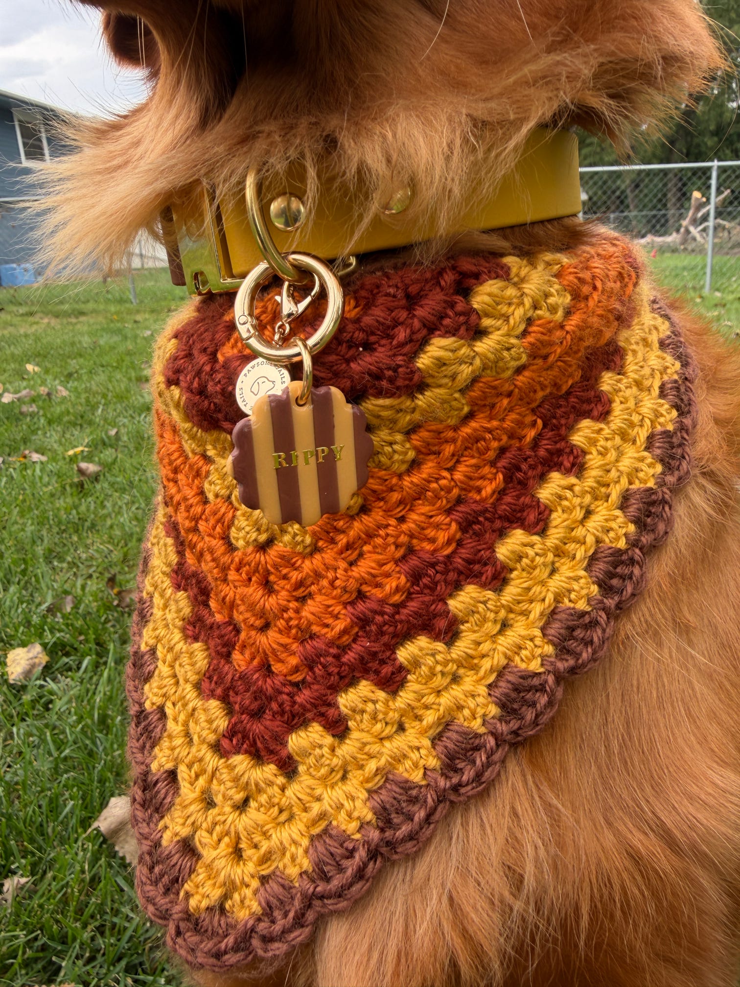 - Pumpkin, rust, gold thin striped bandana with brown ruffle border